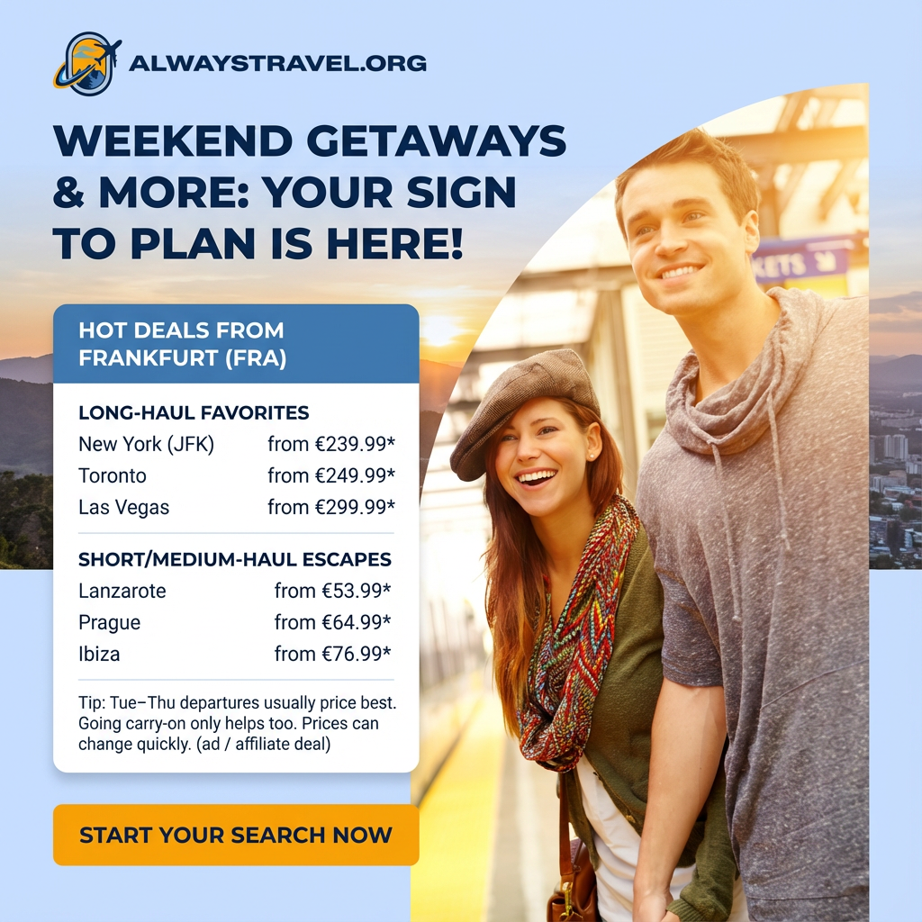 Fresh flight deals departing Frankfurt (FRA): New York from €239.99, Toronto from €249.99, Las Vegas from €299.99, plus Lanzarote, Prague, and Ibiza starting from €53.99. Prices change fast.