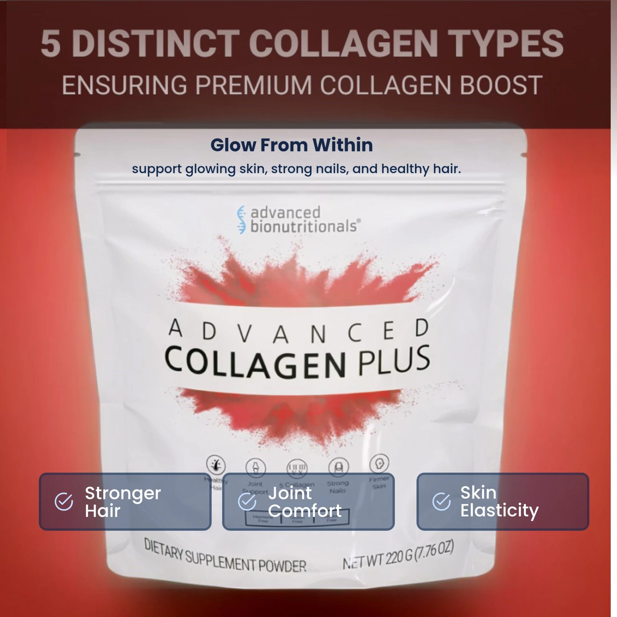 Advanced Collagen Plus combines 5 collagen types from 4 premium sources. Experience more joint flexibility, healthier skin, stronger hair & nail